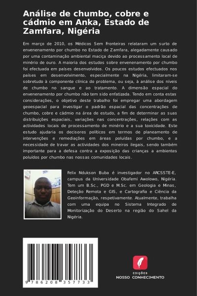 Em março de 2010, os Médicos Sem Fronteiras relataram um surto de envenenamento por chumbo no Estado de Zamfara, alegadamente causado por uma contaminação ambiental maciça devido ao processamento local de minério de ouro. A maioria dos estudos sobre envenenamento por chumbo foi efectuada em países desenvolvidos. Os poucos estudos efectuados nos países em desenvolvimento, especialmente na Nigéria, limitaram-se sobretudo à componente clínica do problema, ou seja, à análise dos níveis de chumbo no sangue e ao tratamento. A dimensão espacial do envenenamento por chumbo não tem sido enfatizada. Tendo em conta estas considerações, o objetivo deste trabalho foi empregar uma abordagem geoespacial para investigar o padrão espacial das concentrações de chumbo, cobre e cádmio na área de estudo, a fim de determinar as suas distribuições espaciais, variações nas concentrações, relações com as actividades locais de processamento de minério e a sua toxicidade. Este estudo ajudaria os decisores políticos em termos de planeamento de intervenções e remediações em áreas poluídas por chumbo, e a necessidade de travar as actividades dos mineiros ilegais, sendo também importante para a defesa contra a exposição das crianças a ambientes poluídos por chumbo nas nossas comunidades locais.
