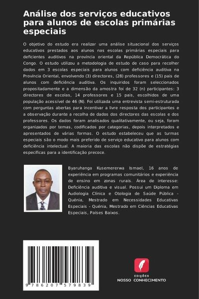 O objetivo do estudo era realizar uma análise situacional dos serviços educativos prestados aos alunos nas escolas primárias especiais para deficientes auditivos na província oriental da República Democrática do Congo. O estudo utilizou a metodologia de estudo de caso para recolher dados em 3 escolas especiais para alunos com deficiência auditiva na Província Oriental, envolvendo (3) directores, (28) professores e (15) pais de alunos com deficiência auditiva. Os inquiridos foram seleccionados propositadamente e a dimensão da amostra foi de 32 (n) participantes: 3 directores de escolas, 14 professores e 15 pais, escolhidos de uma população acessível de 46 (N). Foi utilizada uma entrevista semi-estruturada com perguntas abertas para incentivar a livre resposta dos participantes e a observação durante a recolha de dados dos directores das escolas e dos professores. Os dados foram analisados qualitativamente, ou seja, foram organizados por temas, codificados por categorias, depois interpretados e apresentados de várias formas. O estudo estabeleceu que as turmas especiais são o modo mais preferido de serviço educativo para alunos com deficiência intelectual. A maioria das escolas não dispõe de estratégias específicas para a identificação precoce.