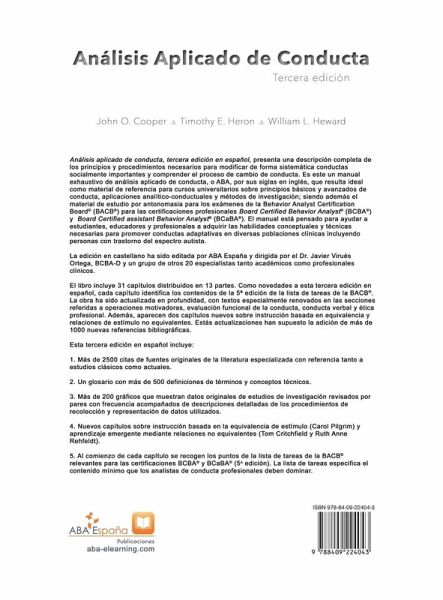 Análisis aplicado de conducta, tercera edición en español, presenta una descripción completa de los principios y procedimientos necesarios para modificar de forma sistemática conductas socialmente importantes y comprender el proceso de cambio de conducta. Es este un manual exhaustivo de análisis aplicado de conducta, o ABA, por sus siglas en inglés, que resulta ideal como material de referencia para cursos universitarios sobre principios básicos y avanzados de conducta, aplicaciones analítico-conductuales y métodos de investigación; siendo además el material de estudio por antonomasia para los exámenes de la Behavior Analyst Certification Board® (BACB®) para las certificaciones profesionales Board Certified Behavior Analyst® (BCBA®) y Board Certified assistant Behavior Analyst® (BCaBA®). El manual está pensado para ayudar a estudiantes, educadores y profesionales a adquirir las habilidades conceptuales y técnicas necesarias para promover conductas adaptativas en diversas poblaciones clínicas incluyendo personas con trastorno del espectro autista. La edición en castellano ha sido editada por ABA España y dirigida por el Dr. Javier Virués Ortega, BCBA-D y un grupo de otros 20 especialistas tanto académicos como profesionales clínicos. El libro incluye 31 capítulos distribuidos en 13 partes. Como novedades a esta tercera edición en español, cada capítulo identifica los contenidos de la 5ª edición de la lista de tareas de la BACB®. La obra ha sido actualizada en profundidad, con textos especialmente renovados en las secciones referidas a operaciones motivadoras, evaluación funcional de la conducta, conducta verbal y ética profesional. Además, aparecen dos capítulos nuevos sobre instrucción basada en equivalencia y relaciones de estímulo no equivalentes. Estás actualizaciones han supuesto la adición de más de 1000 nuevas referencias bibliográficas. CONTENIDOS Capítulo 1 Definición y características del análisis aplicado de conducta 2 Capítulo 2 Conceptos básicos y principios 25 Capítulo 3 Selección y definición de las conductas de interés 48 Capítulo 4 Medición de la conducta 73 Capítulo 5 Evaluación y mejora de la calidad de la medición conductual 101 Capítulo 6 Construcción e interpretación de representaciones gráficas de datos conductuales 124 Capítulo 7 Análisis del cambio de conducta: Asunciones y estrategias básicas 155 Capítulo 8 Diseños de reversión y multielemento 171 Capítulo 9 Diseños de líneabase múltiple y de criterio cambiante 193 Capítulo 10 Planificación y evaluación de la investigación en el análisis aplicado de conducta 216 Capítulo 11 Reforzamiento positivo 252 Capítulo 12 Reforzamiento negativo 287 Capítulo 13 Programas de reforzamiento 301 Capítulo 14 Castigo positivo 326 Capítulo 15 Castigo negativo 352 Capítulo 16 Operaciones motivadoras 372 Capítulo 17 Control del estímulo 395 Capítulo 18 Conducta verbal 412 Capítulo 19 Instrucción basada en la equivalencia 452 Capítulo 20 Aprendizaje emergente con relaciones de estímulo no equivalentes 497 Capítulo 21 Imitación, modelo y aprendizaje observacional 527 Capítulo 22 Moldeamiento 540 Capítulo 23 Encadenamiento 557 Capítulo 24 Extinción 582 Capítulo 25 Reforzamiento diferencial 595 Capítulo 26 Intervenciones sobre antecedentes 613 Capítulo 27 Evaluación de la conducta funcional 628 Capítulo 28 Economía de fichas, contingencias grupales, y contratos de contingencias 656 Capítulo 29 Autogestión 681 Capítulo 30 Generalización y mantenimiento del cambio de conducta 714 Capítulo 31 Responsabilidades éticas y profesionales de los analistas aplicados de conducta 758