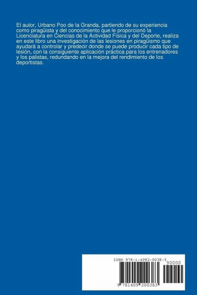 El autor, Urbano Poo de la Granda, partiendo de su experiencia como piragüista y del conocimiento que le proporcionó la Licenciatura en Ciencias de la Actividad Física y del Deporte, realiza en este libro una investigación de las lesiones en piragüismo que ayudará a controlar y predecir donde se puede producir cada tipo de lesión, con la consiguiente aplicación práctica para los entrenadores y los palistas, redundando en la mejora del rendimiento de los deportistas.
