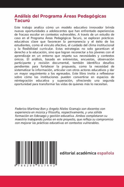 Este trabajo analiza cómo un modelo educativo innovador brinda nuevas oportunidades a adolescentes que han enfrentado experiencias de fracaso escolar en contextos vulnerables. A través de un estudio de caso en el Programa Áreas Pedagógicas Tacurú, se exploran prácticas educativas clave que favorecen la permanencia y el éxito de los estudiantes, como el vínculo afectivo, el cuidado del clima institucional y la flexibilidad curricular. Estas estrategias no solo garantizan el derecho a la educación, sino que logran reconectar a los jóvenes con el aprendizaje en un entorno que respeta sus necesidades y contextos únicos. El análisis, basado en entrevistas, encuestas, observación participante y revisión documental, también identifica desafíos pendientes para fortalecer la propuesta, como la necesidad de sistematizar la información, articular con otros actores educativos y dar un mayor seguimiento a los egresados. Este libro invita a reflexionar sobre cómo las instituciones pueden convertirse en espacios de reintegración educativa y superación, ofreciendo una segunda oportunidad para transformar las vidas de quienes más lo necesitan.