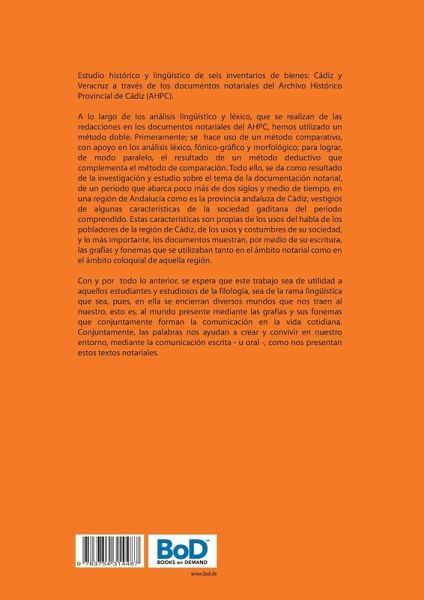 Estudio histórico y lingüístico de seis inventarios de bienes: Cádiz y Veracruz a través de los documentos notariales del Archivo Histórico Provincial de Cádiz (AHPC).A lo largo de los análisis lingüístico y léxico, que se realizan de las redacciones en los documentos notariales del AHPC, hemos utilizado un método doble. Primeramente; se hace uso de un método comparativo, con apoyo en los análisis léxico, fónico-gráfico y morfológico; para lograr, de modo paralelo, el resultado de un método deductivo que complementa el método de comparación. Todo ello, se da como resultado de la investigación y estudio sobre el tema de la documentación notarial, de un periodo que abarca poco más de dos siglos y medio de tiempo, en una región de Andalucía como es la provincia andaluza de Cádiz, vestigios de algunas características de la sociedad gaditana del periodo comprendido. Estas características son propias de los usos del habla de los pobladores de la región de Cádiz, de los usos y costumbres de su sociedad, y lo más importante, los documentos muestran, por medio de su escritura, las grafías y fonemas que se utilizaban tanto en el ámbito notarial como en el ámbito coloquial de aquella región.Con y por todo lo anterior, se espera que este trabajo sea de utilidad a aquellos estudiantes y estudiosos de la filología, sea de la rama lingüística que sea, pues, en ella se encierran diversos mundos que nos traen al nuestro, esto es, al mundo presente mediante las grafías y sus fonemas que conjuntamente forman la comunicación en la vida cotidiana. Conjuntamente, las palabras nos ayudan a crear y convivir en nuestro entorno, mediante la comunicación escrita - u oral -, como nos presentan estos textos notariales.
