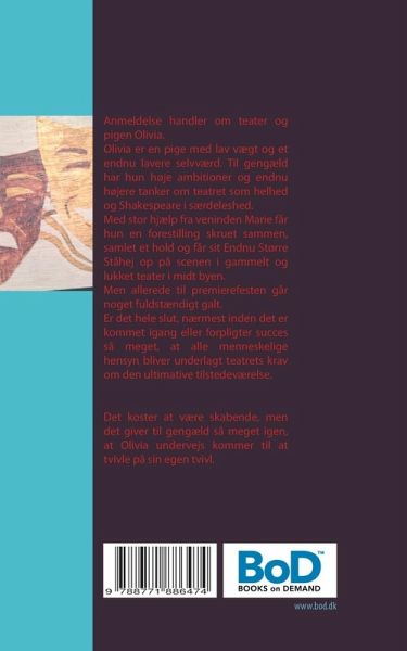 Med den slags ord er vi ganske enkelt forpligtede til at være mere end mennesker, vi er Thalias Tjenere, vi er skuespillere for Gods sake. Anmeldelse handler om teater og Olivia. Olivia er en pige med lav vægt og et endnu lavere selvværd. Til gengæld har hun høje ambitioner og endnu højere tanker om teatret som helhed og Shakespeare i særdeleshed. Med stor hjælp fra veninden Marie får hun en forestilling skruet sammen, samlet et hold og får sit Endnu Større Ståhej op på scenen i et gammelt og ellers lukket teater i midt byen. Men allerede til premierefesten går noget fuldstændigt galt. Er det hele slut, nærmest inden det er kommet igang, eller forpligter succes så meget, at alle menneskelige hensyn bliver underlagt teatrets krav om den ultimative tilstedeværelse? Bogen giver et indblik i, hvordan teater og mennesker spiller sammen. Hvordan pigen Olivia og instruktøren Olivia kæmper om pladsen og de vågne timer. Det koster at være skabende, men det giver til gengæld så meget igen, at Olivia undervejs kommer til at tvivle på sin egen tvivl. Lars Thelonius har beskæftiget sig med teater og Shakespeare i mange år. Bla som stifter og leder af THE LOYAL SHAKESPEARE COMPANY. Han er i dag Teaterlærer på Hoptrup Efterskole. Efterskolen for Scenekunst i Danmark.