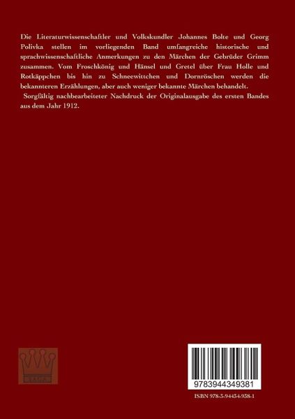 Die Literaturwissenschaftler und Volkskundler Johannes Bolte und Georg Polivka stellen im vorliegenden Band umfangreiche historische und sprachwissenschaftliche Anmerkungen zu den Märchen der Gebrüder Grimm zusammen. Vom Froschkönig und Hänsel und Gretel über Frau Holle und Rotkäppchen bis hin zu Schneewittchen und Dornröschen werden die bekannteren Erzählungen, aber auch weniger bekannte Märchen behandelt. Sorgfältig nachbearbeiteter Nachdruck der Originalausgabe des ersten Bandes aus dem Jahr 1912.