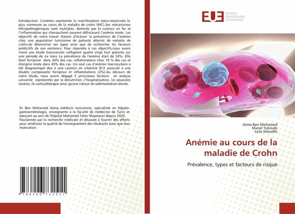 Introduction :L'anémie représente la manifestation extra-intestinale la plus commune au cours de la maladie de crohn (MC).Ses mécanismes éthiopathogéniques sont multiples, dominés par la carence en fer et l'inflammation qui chevauchent souvent définissant l'anémie mixte. Les objectifs de notre travail étaient d'évaluer la prévalence de l'anémie chez une population tunisienne de patients atteints de maladie de crohn,de déterminer ses types ainsi que de rechercher les facteurs prédictifs de son existence. Pour répondre à ces objectifs,nous avons mené une étude transversale colligeant quatre vingt huit patients sur une période de six mois La prévalence de l'anémie était de 53%. Elle était ferriprive dans 34% des cas, inflammatoire chez 19 % des cas et d'origine mixte dans 45% des cas. Un seul cas d'anémie macrocytaire a été diagnostiqué due à une carence en vitamine B12 associée à une double composante ferriprive et inflammatoire (2%).Au décours de notre étude, nous avons dégagé 5 principaux facteurs en analyse univariée représentés par la dénutrition ,l'hospitalisation, les poussées sévères, là corticothérapie ainsi qu'une vitesse de sédimentation élevée.