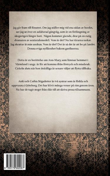 Jag går fram till fönstret. Om jag ställer mig vid ena sidan av bordet, ser jag ut över en asfalterad gångväg, som är en förlängning av skogsvägen längre bort. Någon kommer gående, drar på en rutig dramaten av sextiotalsmodell. Vem är det? Nu har tårarna torkat. Jag skrattar åt min undran. Vem är det? Det är så det är att bo på landet. Denna eviga nyfikenhet bakom gardinerna. Detta är en berättelse om Ann-Mary, som lämnar hemmet i Värmland i unga år för att komma ifrån förtryck och missbruk. Cirkeln sluts när hon åtskilliga år senare väljer att flytta tillbaka.