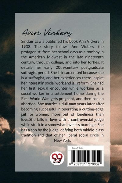 Sinclair Lewis published his book Ann Vickers in 1933. The story follows Ann Vickers, the protagonist, from her school days as a tomboy in the American Midwest in the late nineteenth century, through college, and into her forties. It details her early 20th-century postgraduate suffragist period. She is incarcerated because she is a suffragist, and her experiences there inspire her interest in social work and jail reform. She had her first sexual encounter while working as a social worker in a settlement home during the First World War, gets pregnant, and then has an abortion. She marries a…mehr
