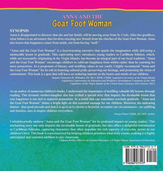 Anna and the Goat Foot Woman" is a heartwarming children's tale following Anna's journey from disappointment to self-discovery. When Anna's family relocates from St. Croix, she embarks on a thrilling adventure where she learns valuable lessons about friendship and the true meaning of happiness. Along the way, Anna encounters the mysterious Goat Foot Woman, a legendary figure who challenges her courage and compassion. Through bravery and empathy, Anna discovers that happiness isn't found in possessions, but within oneself. Join Anna on this captivating adventure filled with courage, friendship, and the power of inner strength.