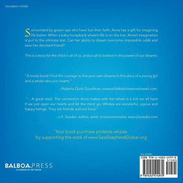 Surrounded by grown-ups who have lost their faith, Anna has a gift for imagining life better. When a baby humpback whale's life is on the line, Anna's imagination is put to the ultimate test. Can her ability to dream overcome impossible odds and save her doomed friend? This is a story for the child in all of us, and a call to believe in the power of our dreams. "A lovely book! Find the courage to live your own dreams in this story of a young girl and a whale who join hearts." - Roberta Quist Goodman; www.wilddolphinswimshawaii.com. "...A great read. The connection Anna makes with her whale is a link we all have if we just open our hearts and let the mind go. Whales are wonderful, joyous and happy beings. They are friends and not food." - J.H. Soeder; author, artist, environmentalist; www.jhsoeder.com Your book purchase protects whales by supporting the work of www.SeaShepherdGlobal.org