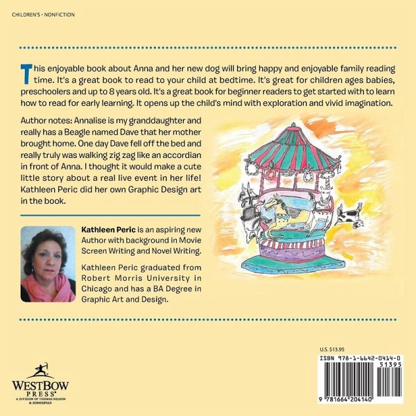 This enjoyable book about Anna and her new dog will bring happy and enjoyable family reading time. It's a great book to read to your child at bedtime. It's great for children ages babies, preschoolers and up to 8 years old. It's a great book for beginner readers to get started with to learn how to read for early learning. It opens up the child's mind with exploration and vivid imagination. Author notes: Annalise is my granddaughter and really has a Beagle named Dave that her mother brought home. One day Dave fell off the bed and really truly was walking zig zag like an accordian in front of Anna. I thought it would make a cute little story about a real live event in her life! Kathleen Peric did her own Graphic Design art in the book.