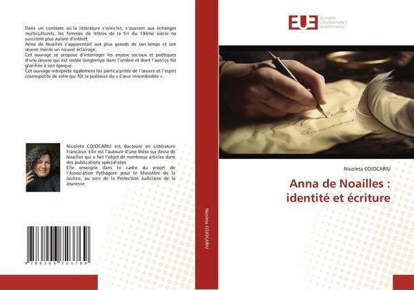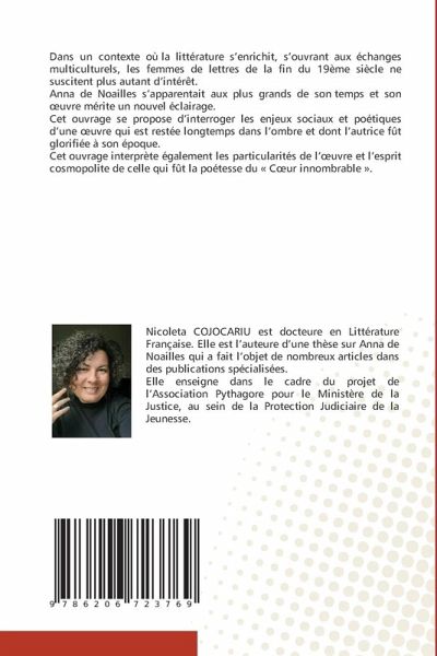 Dans un contexte où la littérature s'enrichit, s'ouvrant aux échanges multiculturels, les femmes de lettres de la fin du 19ème siècle ne suscitent plus autant d'intérêt. Anna de Noailles s'apparentait aux plus grands de son temps et son oeuvre mérite un nouvel éclairage. Cet ouvrage se propose d'interroger les enjeux sociaux et poétiques d'une oeuvre qui est restée longtemps dans l'ombre et dont l'autrice fût glorifiée à son époque. Cet ouvrage interprète également les particularités de l'oeuvre et l'esprit cosmopolite de celle qui fût la poétesse du « Coeur innombrable ».