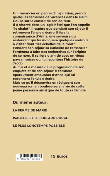 Un romancier en panne d'inspiration, prends quelques semaines de vacances dans le Haut-Doubs sur le conseil de son éditeur.Il a réservé dans un logis hôtel que l'on appelle "le chalet". Il espère que pendant son séjour il retrouvera l'envie d'écrire. Il fera la connaissance d'Anna, une serveuse du restaurant qui lui indiquera quelques endroits à visiter dont "les échelles de la mort".Pendant son séjour sa curiosité de romancier l'amènera à faire des recherches sur l'origine de ce nom. Il se liera d'amitié avec un vieux paysan suisse qui lui racontera l'histoire de Jacob.Au fur et à mesure de la progression de son enquête et de son séjour, il tombera éperdument amoureux d'Anna qui lui redonnera l'envie d'écrire.Mais ce qu'il découvrira en rédigeant son nouveau roman bouleversera la vie de cette jeune personne ainsi que de toute sa famille.