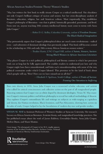 Vivian M. May explores the theoretical and political contributions of Anna Julia Cooper, a renowned Black feminist scholar, educator and activist whose ideas deserve far more attention than they have received. Drawing on Africana and feminist theory, May places Cooper's theorizing in its historical contexts and offers new ways to interpret the evolution of Cooper's visionary politics, subversive methodology, and defiant philosophical outlook. Rejecting notions that Cooper was an elitist duped by dominant ideologies, May contends that Cooper's ambiguity, code-switching, and irony should be understood as strategies of a radical methodology of dissent.