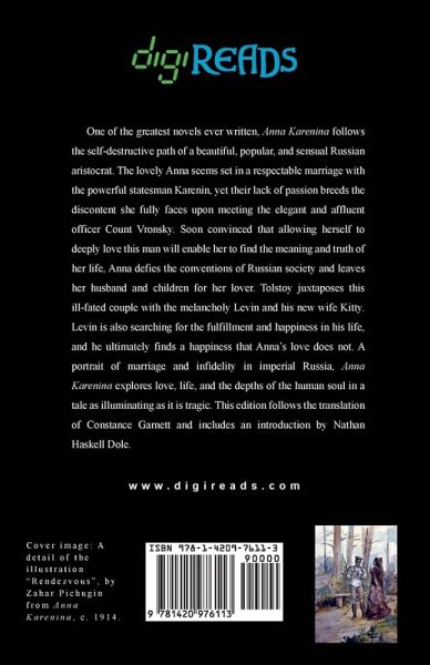 One of the greatest novels ever written, "Anna Karenina" follows the self-destructive path of a beautiful, popular, and sensual Russian aristocrat. The lovely Anna seems set in a respectable marriage with the powerful statesman Karenin, yet their lack of passion breeds the discontent she fully faces upon meeting the elegant and affluent officer Count Vronsky. Soon convinced that allowing herself to deeply love this man will enable her to find the meaning and truth of her life, Anna defies the conventions of Russian society and leaves her husband and children for her lover. Tolstoy juxtaposes this ill-fated couple with the melancholy Levin and his new wife Kitty. Levin is also searching for the fulfillment and happiness in his life, and he ultimately finds a happiness that Anna's love does not. A portrait of marriage and infidelity in imperial Russia, "Anna Karenina" explores love, life, and the depths of the human soul in a tale as illuminating as it is tragic. This edition is printed on premium acid-free paper, follows the translation of Constance Garnett, and includes an introduction by Nathan Haskell Dole.