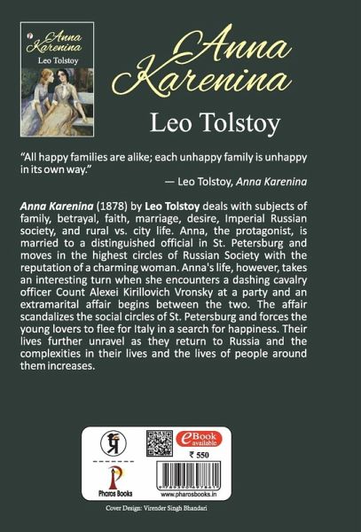 "All happy families are alike; each unhappy family is unhappy in its own way." ― Leo Tolstoy, Anna Karenina Anna Karenina (1878) by Leo Tolstoy deals with subjects of family, betrayal, faith, marriage, desire, Imperial Russian society, and rural vs. city life. Anna, the protagonist, is married to a distinguished official in St. Petersburg and moves in the highest circles of Russian Society with the reputation of a charming woman. Anna's life, however, takes an interesting turn when she encounters a dashing cavalry officer Count Alexei Kirillovich Vronsky at a party and an extramarital affair begins between the two. The affair scandalizes the social circles of St. Petersburg and forces the young lovers to flee for Italy in a search for happiness. Their lives further unravel as they return to Russia and the complexities in their lives and the lives of people around them increases.