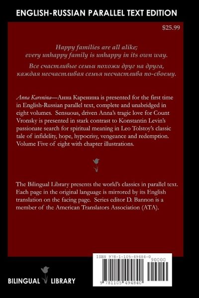 Anna Karenina is presented for the first time in English-Russian parallel text, complete and unabridged in eight volumes. Sensuous, driven Anna's tragic love for Count Vronsky is presented in stark contrast to Konstantin Levin's passionate search for spiritual meaning in Leo Tolstoy's classic tale of infidelity, hope, hypocrisy, vengeance and redemption. Volume Five of eight with chapter illustrations.