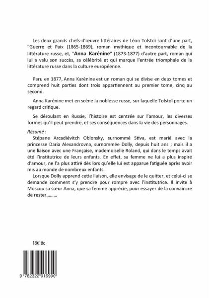 Paru en 1877, ANNA KARENINE est un roman de Léon Tolstoï qui se divise en deux tomes et comprend huit parties dont trois appartiennent au premier tome et cinq au second.Se déroulant en Russie, l'histoire est centrée sur l'amour, ses diverses formes et les conséquences dans la vie.Connaissant un grand succès, ce chef d'oeuvre marque également l'entrée triomphante de la littérature russe dans la culture européenne.Résumé:Stépan Arkadiévitch Oblonskï, surnommé Stiva est marié avec la princesse Daria Alexandrovna, surnommée Dolly, depuis huit ans. Ce dernier entretient une liaison avec une française, Mademoiselle Roland, qui avait été l'institutrice des ses enfants.Lorsque Dolly apprend cette liaison, elle envisage de le quitter, et celui-ci se demande comment s'y prendre pour rompre avec l'institutrice. Il invite à Moscou sa soeur ANNA, que sa femme apprécie pour essayer de la convaincre de rester.....Bonne lecture......