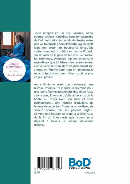 Texte intégral en un seul volume. Anna, épouse d'Alexis Karénine, haut fonctionnaire de l'administration impériale de Russie, mène une vie tranquille à Saint Pétersbourg en 1880. Mais son destin est bouleversé lorsqu'elle croise le regard du séduisant comte Wronski sur un quai de la gare de Moscou. La passion les submerge. Aveuglée par les lendemains merveilleux que lui laisse miroiter son amant, elle fait alors le choix de vivre pleinement son amour, en femme libre, tout en assumant le regard réprobateur d'un milieu social de plus en plus pesant.