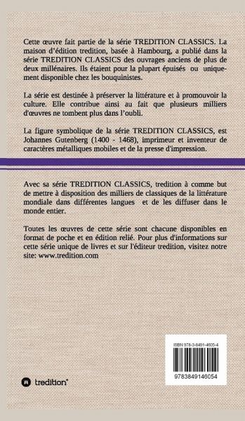 Cette uvre (édition relié) fait partie de la série TREDITION CLASSICS. La maison d édition tredition, basée à Hambourg, a publié dans la série TREDITION CLASSICS des ouvrages anciens de plus de deux millénaires. Ils étaient pour la plupart épuisés ou uniquement disponible chez les bouquinistes. La série est destinée à préserver la littérature et à promouvoir la culture. Avec sa série TREDITION CLASSICS, tredition à comme but de mettre à disposition des milliers de classiques de la littérature mondiale dans différentes langues et de les diffuser dans le monde entier.