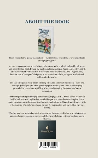 This biography traces Anna Leigh Waters' journey from a homeschooled Florida girl with a paddle in her hand to a world-renowned teenage athlete at the forefront of pickleball's explosion in popularity.Through 15 richly detailed chapters and a powerful conclusion, the book explores: Her early beginnings: Playing pickleball with her mom during a hurricane evacuation - and discovering a life-changing passion. Her rapid rise: Becoming a pro at age 12 and shattering expectations across age and gender lines. Her challenges: Managing pressure, expectations, and fame while still growing up. Her leadership: Inspiring the next generation and using her platform to promote inclusion, discipline, and global sport expansion. The sport itself: How Anna Leigh became a symbol of pickleball's potential to go Olympic, reach international audiences, and become a respected global game