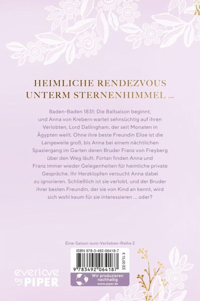 Es handelt sich um den zweiten, separat lesbaren Band der Reihe "Eine Saison zum Verlieben" und noch während ich Annas und Franz' zarte Love Story begeistert in einem Rutsch verschlang, wanderte bereits der Vorgängerband ("Elise – Die Lady und ihre Verehrer") auf Platz 1 meiner Wunschliste.