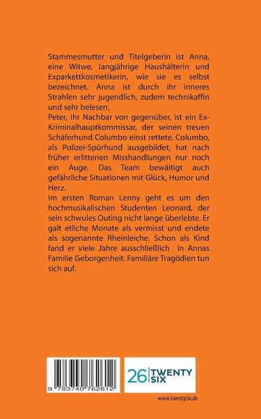 Stammesmutter und Titelgeberin ist Anna, eine Witwe, langjährige Haushälterin und Exparkettkosmetikerin, wie sie es selbst bezeichnet. Anna ist durch ihr inneres Strahlen sehr jugendlich, zudem technikaffin und sehr belesen. Peter, ihr Nachbar von gegenüber, ist ein Ex-Kriminalhauptkommissar, der seinen treuen Schäferhund Columbo einst rettete. Columbo, als Polizei-Spürhund ausgebildet, hat nach früher erlittenen Misshandlungen nur noch ein Auge. Das Team bewältigt auch gefährliche Situationen mit Glück, Humor und Herz. Im ersten Roman Lenny geht es um den hochmusikalischen Studenten Leonard,…mehr