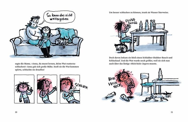 Anna hat ein großes Problem. Sie wird unheimlich schnell und schrecklich oft wütend. Viel schneller und viel stärker als die anderen Kinder. Und die Wut ist immer riesengroß. Wenn die Wut über Anna herfällt, werden ihre Haare zu Igelstacheln, sie muss heulen, fluchen, beißen und spucken. Jeder, der nur in ihre Nähe kommt, bekommt etwas von ihrer Riesenwut ab. Die anderen Kinder wollen nicht mehr mit Anna spielen. Und Anna mag gar nicht mehr aus ihrem Zimmer kommen. Mama und Papa und auch Oma versuchen es mit Tipps, wie Anna die Wut bändigen kann. Der Wut aus dem Weg gehen, hilft aber ebenso wenig, wie der Versuch, sie runterzuschlucken. Die Wut ist stärker als Anna. Bis Opa eine tolle Idee hat und ihr eine Trommel schenkt. Immer wenn die Wut kommt, trommelt Anna ganz laut. Bis sie sie schließlich weggetrommelt hat.