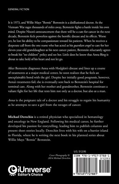 It is 1973, and Willie Mays "Bernie" Bernstein is a disillusioned doctor. As the Vietnam War rages thousands of miles away, Bernstein fights a battle inside his own mind. Despite Nixon’s announcement that there will be a cure for cancer in the next decade, Bernstein feels powerless against the horrific disease and its effects. Worse yet, he lost his ability to be compassionate toward his patients. When he receives a desperate call from the one nurse who has acted as his guardian angel to care for her eleven-year-old granddaughter as his next cancer patient, Bernstein reluctantly agrees to break his "no children" policy and see her. Little does he know that Anna Bing is about to take hold of his heart and not let go. After Bernstein diagnoses Anna with Hodgkin’s disease and lines up a course of treatments at a major medical center, he soon realizes that he feels an unexplainable bond with the girl. Despite her initially good prognosis, however, Anna’s treatments fail; she is eventually sent back to Bernstein’s hospital for terminal care. Along with her mother and grandmother, Bernstein continues a valiant fight for her life that tests him not only as a doctor, but also as a man. Anna is the poignant tale of a doctor and his struggle to regain his humanity as he attempts to save a girl from the ravages of cancer.