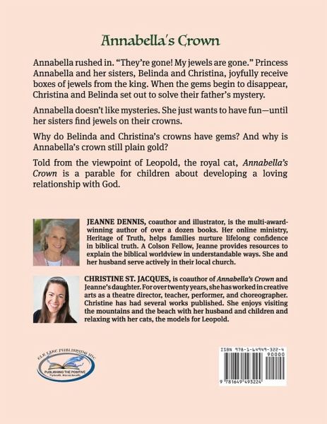 Annabella rushed in. "They're gone! My jewels are gone." Princess Annabella and her sisters, Belinda and Christina, joyfully receive boxes of jewels from the king. When the gems begin to disappear, Christina and Belinda set out to solve their father's mystery. Annabella doesn't like mysteries. She just wants to have fun-until her sisters find jewels on their crowns. Why do Belinda and Christina's crowns have gems? And why is Annabella's crown still plain gold? Told from the viewpoint of Leopold, the royal cat, Annabella's Crown is a parable for children about developing a loving relationship with God.