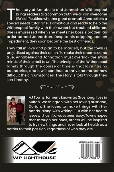The story of Annabelle and Johnathan Witherspool brings readers to a common truth: we all can overcome life's difficulties, whether great or small. Annabelle is a special needs tutor. She is ambitious and ready to help the Witherspool family with their sweet but troubled children. She is impressed when she meets her boss's brother, an artist named Johnathan. Despite his crippling speech impediment, they soon become the best of friends. They fall in love and plan to be married, but the town is prejudiced against their union. To make their dreams come true, Annabelle and Johnathan must overlook the small minds of their small town. The principle of the Witherspool family through the course of time is that love has no boundaries, and it will continue to thrive no matter how difficult the circumstances. The story is told through their son Timothy.