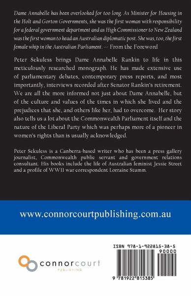 Australian Biographical Monographs, No. 18. Dame Annabelle has been overlooked for too long. As Minister for Housing in the Holt and Gorton Governments, she was the first woman with responsibility for a federal government department and as High Commissioner to New Zealand was the first woman to head an Australian diplomatic post. She was, too, the first female whip in the Australian Parliament. -- From the Foreword Peter Sekuless brings Dame Annabelle Rankin to life in this meticulously researched monograph. He has made extensive use of parliamentary debates, contemporary press reports, and most importantly, interviews recorded after Senator Rankin's retirement. We are all the more informed not just about Dame Annabelle, but of the culture and values of the times in which she lived and the prejudices that she, and others like her, had to overcome. Her story also tells us a lot about the Commonwealth Parliament itself and the nature of the Liberal Party which was perhaps more of a pioneer in women's rights than is usually acknowledged. Peter Sekuless is a Canberra-based writer who has been a press gallery journalist, Commonwealth public servant and government relations consultant. His books include the life of Australian feminist Jessie Street and a profile of WW11 war correspondent Lorraine Stumm.