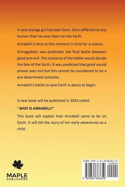 A very strange girl has been born. She's different to any human that has ever been on the Earth. Annabell is here at this moment in time for a reason. Armageddon was predicted, the final battle between good and evil. The outcome of the battle would decide the fate of the Earth. It was predicted that good would prevail over evil but this can not be consider to be a pre-determined outcome. Annabells battle to save the Earth is about to begin.