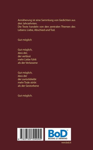 Annäherung ist eine Sammlung von Gedichten aus drei Jahrzehnten.Die Texte handeln von den zentralen Themen des Lebens: Liebe, Abschied und Tod.Gut möglichGut möglich,dass der,der verlässtmehr Liebe fühltals der VerlasseneGut möglich, dass der,der zurückbleibtmehr Tode stirbtals der GestorbeneGut möglich.