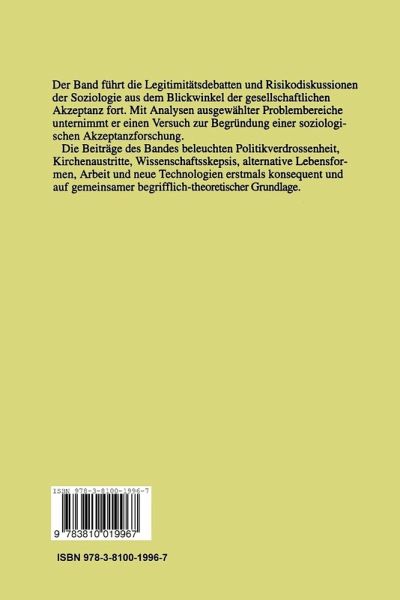 Annahme und Ablehnung liegen nahe beieinander, oft durch nicht mehr als ein ,Ja' oder ,Nein', eine entgegennehmende oder zurückweisende Geste ge trennt. Annahme verweigert als der captationes benevolentiae mißachtende Titel des Buches überschreibt nicht nur diese Beiträge zur soziologischen Akzeptanzforschung. Er steht auch für eine Erfahrung, die die Autorinnen und Autoren während ihrer Entstehung gemacht haben. Der Band ist das Ergebnis eines mittlerweile mehrjährigen Forschungs und Lernprozesses, der als Individualprojekt begann und mit dieser Gemein schaftspublikationeine Fortsetzung fmdet. Die Beiträge nehmen an der 1995 ebenfalls bei Leske + Budrich erschienenen Habilitationsschrift von Doris Lucke Akzeptanz. Legitimität in der "Abstimmungsgesellschaft" ihren Aus gang und führen die Legitimitätsdebatten und soziologischen Risikodiskus sionen in der dort begonnenen subjektorientierten Perspektive fort. Als ,work in progress' beleuchten sie für ausgewählte GegenstandsbereichePolitikver drossenheit, Kirchenaustritte, Wissenschaftsskepsis, alternative Lebens- und Arbeitsformen sowie neue Technologien erstmals auf gemeinsamer begriff lich-theoretischer Grundlage und mit einem konsequent gegen die Sichtwei sen und einseitigen Legitimationsdebatten der bisherigen Soziologie gerichte ten Blick. Auf diese Weise wird vermeintlich Altbekanntes neu entdeckt und sym bolische Politik, Glaubensfragen, Expertenmeinungen, experimentelle Le bensführungen, avantgardistische Arbeitsorganisationen, pionierhafte Zeit managements und technische Errungenschaften aus der Perspektive gesell schaftlicher Akzeptanz reanalysiert. Dabei gelangen die Autorinnen und Au toren zu z.T. überraschenden und theoretisch wie empirisch weiterführenden Erkenntnissen, die künftige Akzeptanzstudien im mehr als sprichwörtlichen Sinne der FRIN-Konvention -,Further Research ls Needed' -anregen kön nen.
