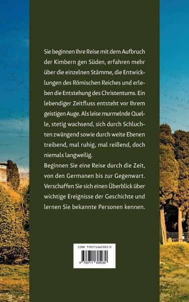 Sie beginnen Ihre Reise mit dem Aufbruch der Kimbern gen Süden, erfahren mehr über die einzelnen Stämme, die Entwicklungen des Römischen Reiches und erleben die Entstehung des Christentums. Ein lebendiger Zeitfluss entsteht vor Ihrem geistigen Auge. Als leise murmelnde Quelle, stetig wachsend, sich durch Schluchten zwängend sowie durch weite Ebenen treibend, mal ruhig, mal reißend, doch niemals langweilig.Beginnen Sie eine Reise durch die Zeit, von den Germanen bis zur Gegenwart. Verschaffen Sie sich einen Überblick über wichtige Ereignisse der Geschichte und lernen Sie bekannte Personen kennen.
