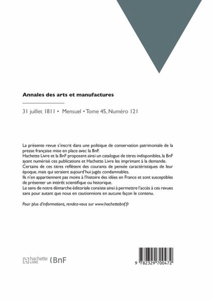 Annales des arts et manufactures, ou Mémoires technologiques sur les découvertes modernes concernant les arts, les manufactures, l'agriculture et le commerce / par R. O'Reilly, ... Date de l'édition originale: 1811-07-31 La présente revue s'inscrit dans une politique de conservation patrimoniale de la presse française mise en place avec la BnF. Hachette Livre et la BnF proposent ainsi un catalogue de titres indisponibles, la BnF ayant numérisé ces publications et Hachette Livre les imprimant à la demande. Certains de ces titres reflètent des courants de pensée caractéristiques de leur époque, mais qui seraient aujourd'hui jugés condamnables. Ils n'en appartiennent pas moins à l'histoire des idées en France et sont susceptibles de présenter un intérêt scientifique ou historique. Le sens de notre démarche éditoriale consiste ainsi à permettre l'accès à ces revues sans pour autant que nous en cautionnions en aucune façon le contenu. Pour plus d'informations, rendez-vous sur www.hachettebnf.fr