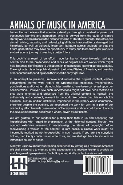 Annals Of Music In America: A Chronological Record Of Significant Musical Events, From 1640 To The Present Day, With Comments On The Various Periods Into Which The Work Is Divided This book is a result of an effort made by us towards making a contribution to the preservation and repair of original classic literature. In an attempt to preserve, improve and recreate the original content, we have worked towards: 1. Type-setting & Reformatting: The complete work has been re-designed via professional layout, formatting and type-setting tools to re-create the same edition with rich typography, graphics, high quality images, and table elements, giving our readers the feel of holding a 'fresh and newly' reprinted and/or revised edition, as opposed to other scanned & printed (Optical Character Recognition - OCR) reproductions. 2. Correction of imperfections: As the work was re-created from the scratch, therefore, it was vetted to rectify certain conventional norms with regard to typographical mistakes, hyphenations, punctuations, blurred images, missing content/pages, and/or other related subject matters, upon our consideration. Every attempt was made to rectify the imperfections related to omitted constructs in the original edition via other references. However, a few of such imperfections which could not be rectified due to intentional\unintentional omission of content in the original edition, were inherited and preserved from the original work to maintain the authenticity and construct, relevant to the work. We believe that this work holds historical, cultural and/or intellectual importance in the literary works community, therefore despite the oddities, we accounted the work for print as a part of our continuing effort towards preservation of literary work and our contribution towards the development of the society as a whole, driven by our beliefs. We are grateful to our readers for putting their faith in us and accepting our imperfections with regard to preservation of the historical content. HAPPY READING!