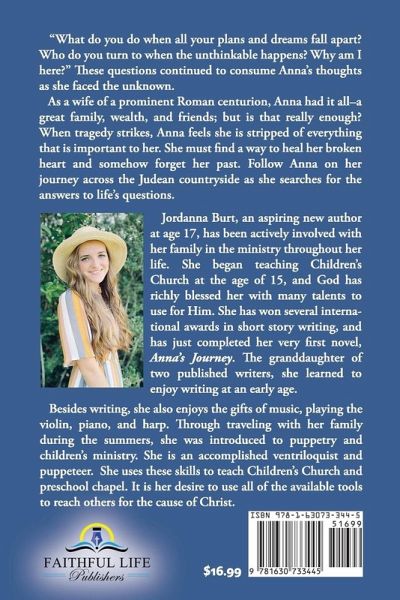"What do you do when all your plans and dreams fall apart? Who do you turn to when the unthinkable happens? Why am I here?" These questions continued to consume Anna's thoughts as she faced the unknown. As a wife of a prominent Roman centurion, Anna had it all--a great family, wealth, and friends; but is that really enough? When tragedy strikes, Anna feels she is stripped of everything that is important to her. She must find a way to heal her broken heart and somehow forget her past. Follow Anna on her journey across the Judean countryside as she searches for the answers to life's questions.