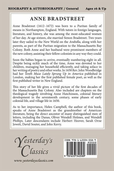Anne Bradstreet (1612-1672) was born to a Puritan family of means in Northampton, England. With tutors in foreign languages, literature, and history, she was among the most-educated women of her day. At age sixteen, she married Simon Bradstreet. Two years later they sailed to the New World on the Arabella, along with her parents, as part of the Puritan migration to the Massachusetts Bay Colony. Both Anne and her husband were prominent members of the new colony, assisting their fellow colonists in any way they could. Despite the arrival of eight children, Anne found time for the writing of poetry, eventually becoming the first published female poet. This story of her life gives a vivid picture of the first decades of the Massachusetts Bay Colony. Also included are chapters on the theological tragedy involving Anne Hutchinson, colonial literary development in the seventeenth century, some phases of early colonial life, and village life in 1650.