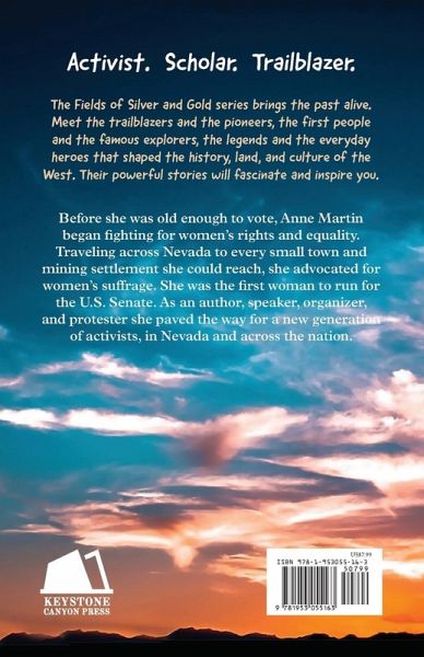 The Fields of Silver and Gold series brings the past alive. Meet the trailblazers and the pioneers, the first people and the famous explorers, the legends and the everyday heroes that shaped the history, land, and culture of the West. Their powerful stories will fascinate and inspire you. Activist. Scholar. Trailblazer. Before she was old enough to vote, Anne Martin began fighting for women's rights and equality. Traveling across Nevada to every small town and mining settlement she could reach, she advocated for women's suffrage. She was the first woman to run for the U.S. Senate. As an author, speaker, organizer, and protester she paved the way for a new generation of activists, in Nevada and across the nation. Lexile: 1170L