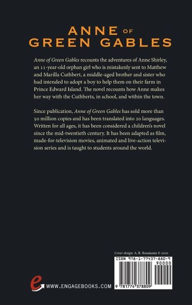Anne of Green Gables recounts the adventures of Anne Shirley, an 11-year-old orphan girl who is mistakenly sent to Matthew and Marilla Cuthbert, a middle-aged brother and sister who had intended to adopt a boy to help them on their farm in Prince Edward Island. The novel recounts how Anne makes her way with the Cuthberts, in school, and within the town. Since publication, Anne of Green Gables has sold more than 50 million copies and has been translated into 20 languages. Written for all ages, it has been considered a children's novel since the mid-twentieth century. It has been adapted as film, made-for-television movies, animated and live-action television series and is taught to students around the world.