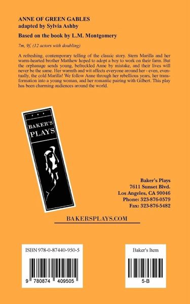 Characters: 9 Female, 7 Male, 12 actors, w/ doubling A refreshing, contemporary telling of the classic story. Stern Marilla and her warm-hearted brother Matthew hoped to adopt a boy to work on their farm. But the orphanage sends young, befreckled Anne by mistake, and their lives will never be the same. Her warmth and wit affects everyone around her - even, eventually, the cold Marilla! We follow Anne through her rebellious years, her transformation into a young woman, and her romanti