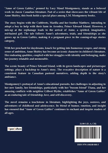 "Anne of Green Gables," penned by Lucy Maud Montgomery, stands as a beloved work in classic Canadian literature. Part of a series that showcases the vibrant life of Anne Shirley, this book holds a special place among L.M. Montgomery books. The story begins with the Cuthberts, Marilla and her brother Matthew, intending to adopt a boy to help with their farm in Avonlea, Prince Edward Island. However, a mix-up at the orphanage leads to the arrival of Anne, a spirited, imaginative, red-haired girl. The tale follows Anne's adventures, trials, and friendships as she grows up in Green Gables, making it a poignant piece in the coming-of-age stories category. With her penchant for daydreams, knack for getting into humorous scrapes, and strong sense of ambition, Anne Shirley has become an iconic character in children's literature. Her endearing qualities, coupled with her struggles with identity and belonging, make her journey relatable and memorable. The scenic beauty of Prince Edward Island, with its green landscapes and picturesque settings, plays a backdrop to Anne's story. The evocative description of nature is a consistent feature in Canadian pastoral narratives, adding depth to the story's ambiance. Montgomery's portrayal of Anne's educational pursuits, her challenges in adjusting to her new family, her friendships, particularly with her "bosom friend" Diana, and her amusing conflicts with neighbor Gilbert Blythe, establishes "Anne of Green Gables" as an enduring tale of friendship, love, and self-discovery. The novel remains a touchstone in literature, highlighting the joys, sorrows, and adventures of childhood and adolescence. Its blend of humor, emotion, and insight has ensured that "Anne of Green Gables" continues to enchant and inspire readers of all ages.