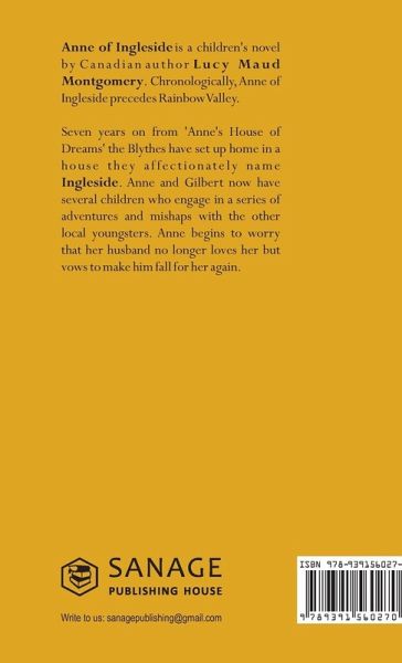 Anne of Ingleside is a children's novel by Canadian author Lucy Maud Montgomery. Chronologically, Anne of Ingleside precedes Rainbow Valley. Seven years on from 'Anne's House of Dreams' the Blythes have set up home in a house they affectionately name Ingleside. Anne and Gilbert now have several children who engage in a series of adventures and mishaps with the other local youngsters. Anne begins to worry that her husband no longer loves her but vows to make him fall for her again.