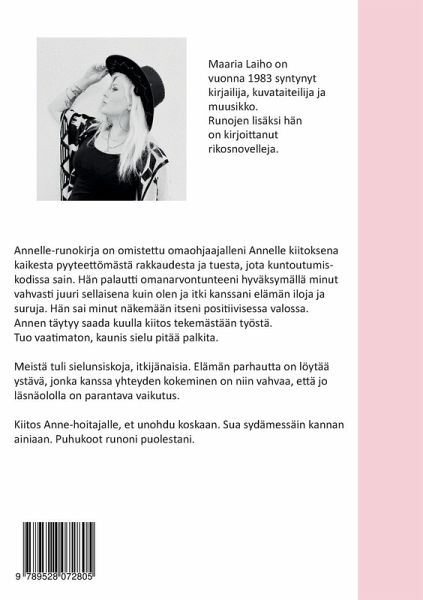 Annelle-runokirja on omistettu omaohjaajalleni Annelle kiitoksena kaikesta pyyteettömästä rakkaudesta ja tuesta, jota kuntoutumis- kodissa sain. Hän palautti omanarvontunteeni hyväksymällä minut vahvasti juuri sellaisena kuin olen ja itki kanssani elämän iloja ja suruja. Hän sai minut näkemään itseni positiivisessa valossa. Annen täytyy saada kuulla kiitos tekemästään työstä. Tuo vaatimaton, kaunis sielu pitää palkita. Meistä tuli sielunsiskoja, itkijänaisia. Elämän parhautta on löytää ystävä, jonka kanssa yhteyden kokeminen on niin vahvaa, että jo läsnäololla on parantava vaikutus. Kiitos Anne-hoitajalle, et unohdu koskaan. Sua sydämessäin kannan ainiaan. Puhukoot runoni puolestani.