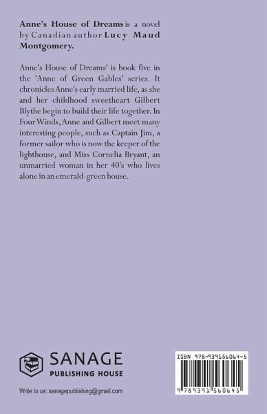 Anne's House of Dreams is a novel by Canadian author Lucy Maud Montgomery. Anne's House of Dreams' is book five in the 'Anne of Green Gables' series. It chronicles Anne's early married life, as she and her childhood sweetheart Gilbert Blythe begin to build their life together. In Four Winds, Anne and Gilbert meet many interesting people, such as Captain Jim, a former sailor who is now the keeper of the lighthouse, and Miss Cornelia Bryant, an unmarried woman in her 40's who lives alone in an emerald-green house.