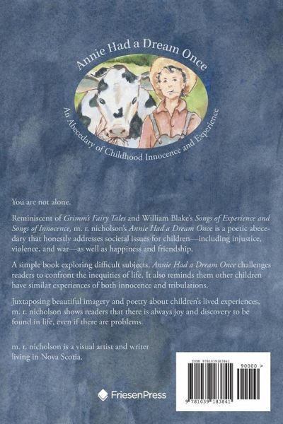 You are not alone. Reminiscent of Grimm's Fairy Tales and William Blake's Songs of Experience and Songs of Innocence, m. r. nicholson's Annie Had a Dream Once is a poetic abecedary that honestly addresses societal issues for children-including injustice, violence, and war-as well as happiness and friendship. A simple book exploring difficult subjects, Annie Had a Dream Once challenges readers to confront the inequities of life. It also reminds them other children have similar experiences of both innocence and tribulations. Juxtaposing beautiful imagery and poetry about children's lived experiences, m. r. nicholson shows readers that there is always joy and discovery to be found in life, even if there are problems. Difficulties in life happen to all of us, so seek joy wherever you can.