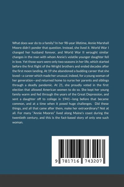 What does war do to a family? In her 98-year lifetime, Annie Marshall Moore didn't ponder that question. Instead, she lived it. World War I changed her husband forever, and World War II wrought similar changes in the man with whom Annie's volatile younger daughter fell in love. Yet those wars were only two seasons in her life, which started before the first flight of the Wright brothers and ended decades after the first moon landing. At 19 she abandoned a budding career that she loved-a career which made her unusual, indeed, for a young woman of her generation-and returned home to nurse her parents and siblings through a deadly pandemic. At 21, she proudly voted in the first election that allowed American women to do so. She kept her young family warm and fed through the years of the Great Depression, and sent a daughter off to college in 1941-long before that became common, and at a time when it posed huge challenges. Did these things, and all that came after them, make her extraordinary? Not at all. Many "Annie Moores" lived along Maine's coast during the twentieth century. This is the fact-based story of one.
