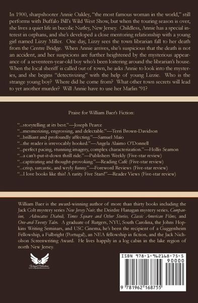 In 1900, sharpshooter Annie Oakley, "the most famous woman in the world" still performs with Buffalo Bill's Wild West Show, but when the touring season is over, she lives a quiet life in bucolic Nutley, New Jersey. Childless, Annie has a special interest in orphans, and she's developed a close mentoring relationship with a young girl named Lizzy Miller. One day, Lizzy sees the town librarian fall to her death from the Centre Bridge. When Annie arrives, she's suspicious that the death is not an accident, and her suspicions are further heightened by the mysterious appearance of a seventeen-year-old boy who's been loitering around the librarian's house. When the local sheriff is called out of town, he asks Annie to look into the mysteries, and she begins "detectivizing" with the help of young Lizzie. Who is the strange young boy? Where did he come from? What other town secrets will lead to yet another murder? Will Annie have to use her Marlin '91?