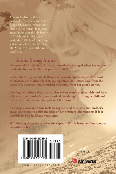 Five-year-old Annie Smith's life is dramatically changed when her mother suddenly dies on the Kansas prairie in 1879. Facing the struggles and challenges of growing up Annie is left to find comfort in her mother's locket, courage from her letters, love from the pages of a diary and the cherished memories from her aunt's stories. Keeping her father's dream alive, that others would stop to visit and leave a flower at her mother's grave, soothed her thoughts through childhood. But what if no one ever stopped or left a flower? As a young woman, Annie feels an urgent need to re-visit her mother's grave. She hopes to enlist the help of her brothers. She wonders if it is possible to find it, fifteen years later. Will finding the grave be what she expects? Will it leave her free to move on with her life?